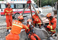 在危機(jī)四伏的地窖救援現(xiàn)場,救援三腳架支撐在地窖口位置上方處,救援人力利用救援三腳架下至到地窖中開采救援工作。